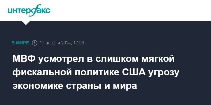 Москва. 17 апреля. INTERFAX.RU - Международный валютный фонд (МВФ) выразил обеспокоенность слишком мягкой налогово-бюджетной политикой Соединенных Штатов и полагает, что она может усложнить задачу по снижению инфляции до целевых 2%, говорится в докладе фонда.
