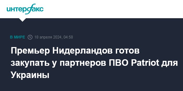 Москва. 18 апреля. INTERFAX.RU - Премьер-министр Нидерландов Марк Рютте предложил закупить системы ПВО Patriot у союзников для последующей поставки их Киеву, сообщила The Guardian.