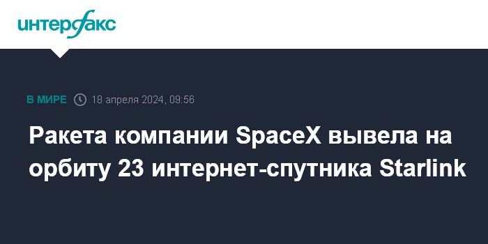 Москва. 18 апреля. INTERFAX.RU - Ракета-носитель Falcon 9 в четверг по московскому времени успешно вывела на орбиту очередную партию из 23 мини-спутников для пополнения орбитальной группировки глобальной сети интернет-покрытия системы Starlink, сообщила компания-разработчик SpaceX.