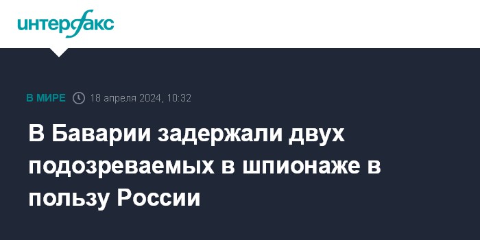 Москва. 18 апреля. INTERFAX.RU - В Баварии задержаны и арестованы двое подозреваемых в шпионаже в пользу России, сообщает Spiegel со ссылкой на офис генерального прокурора Германии. По данным еженедельника, арестованных перевезли в Карлсруэ, где ими займется Федеральный верховный суд Германии.