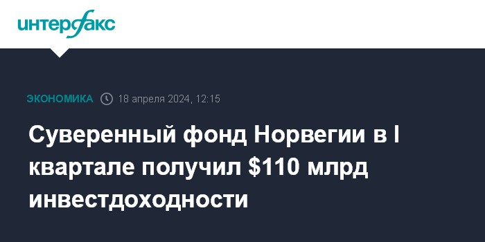 Москва. 18 апреля. INTERFAX.RU - Государственный пенсионный фонд Норвегии (он же Нефтяной фонд), самый большой фонд национального благосостояния в мире, в первом квартале 2024 года зафиксировал инвестиционную доходность в размере 6,3%, или 1,21 трлн норвежских крон ($110 млрд), на фоне роста фондовых рынков и ослабления курса нацвалюты.