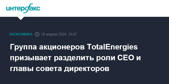 Москва. 18 апреля. INTERFAX.RU - Группа акционеров французской TotalEnergies призывает компанию к разделению ролей главного исполнительного директора и председателя совета директоров, сообщает MarketWatch.