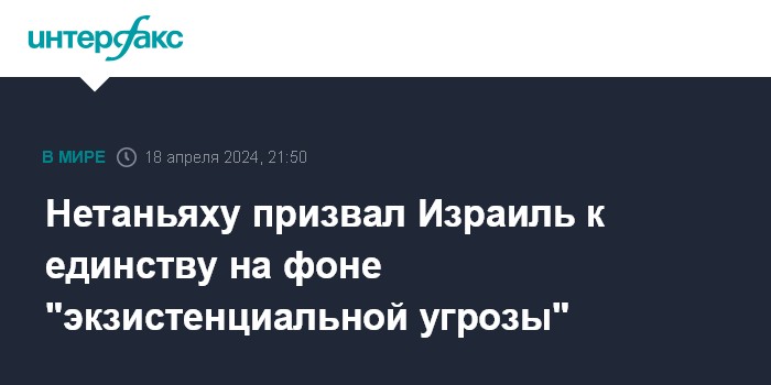 Москва. 18 апреля. INTERFAX.RU - Премьер-министр Израиля Биньямин Нетаньяху призвал граждан Израиля к единству на фоне конфликта в секторе Газа и угрозы со стороны Ирана, сообщает в четверг The Times of Israel.
