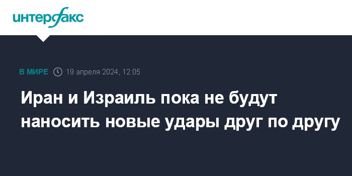 Москва. 19 апреля. INTERFAX.RU - Иран и Израиль на данном этапе не планируют больше осуществлять прямые атаки друг на друга, сообщает CNN со ссылкой на источник в региональных разведслужбах, знакомый с ситуацией в Иране.