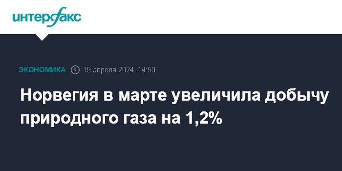 Москва. 19 апреля. INTERFAX.RU - В Норвегии в марте добыча природного газа увеличилась на 1,2% в годовом исчислении, до 10,28 млрд кубометров, по предварительным данным Норвежского офшорного директората (NOD).