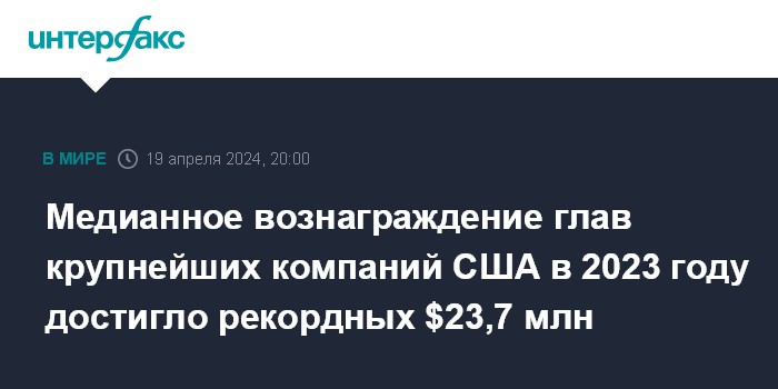 Медианное вознаграждение глав крупнейших компаний США в 2023 году достигло рекордных $23,7 млн