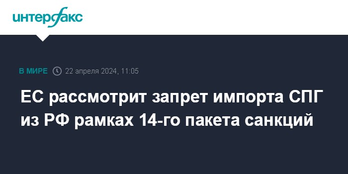 Москва. 22 апреля. INTERFAX.RU - В Евросоюзе намерены рассмотреть идею включения запрета на импорт сжиженного природного газа из РФ в 14-й пакет санкций, заявил глава МИД Швеции Тобиас Билльстрем.