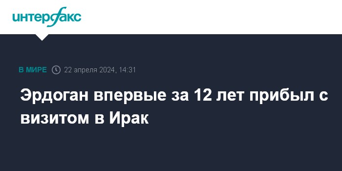 Москва. 22 апреля. INTERFAX.RU - Президент Турции Реджеп Тайип Эрдоган впервые за 12 лет прибыл с официальным визитом в Багдад, там он проведет переговоры с властями Ирака на фоне эскалации напряжённости в регионе, сообщает в понедельник TRT World.