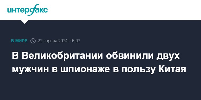 Москва. 22 апреля. INTERFAX.RU - Прокуратура в Великобритании предъявила двум мужчинам обвинения в шпионаже в пользу Китая, сообщают в понедельник британские СМИ.