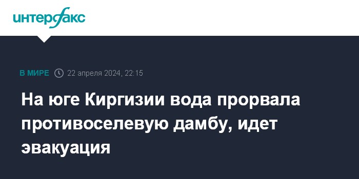 Москва. 22 апреля. INTERFAX.RU - На юге Киргизии за последние три дня сошло 30 селей, жителей 300 домов эвакуируют, сообщает МЧС страны.