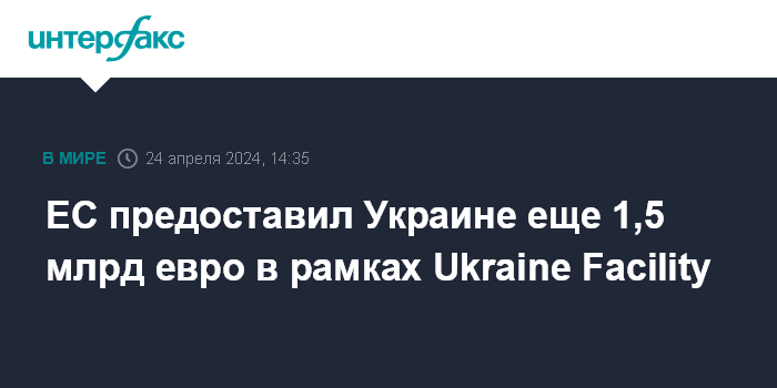 Москва. 24 апреля. INTERFAX.RU - Евросоюз выделил Украине дополнительные 1,5 млрд евро в рамках механизма Ukraine Facility общим объемом в 50 млрд евро, сообщила президент Еврокомиссии Урсула фон дер Ляйен.
