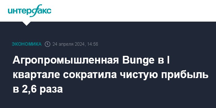 Москва. 24 апреля. INTERFAX.RU - Американская агропромышленная компания Bunge Ltd. в первом квартале снизила чистую прибыль в 2,6 раза, в том числе из-за падения продаж.