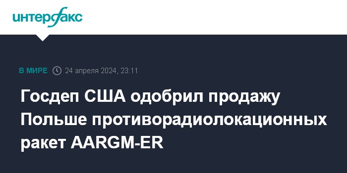 Москва. 24 апреля. INTERFAX.RU - Государственный департамент США одобрил продажу Польше противорадиолокационных управляемых ракет повышенной дальности AARGM-ER, сообщило в среду Агентство по сотрудничеству в области безопасности Пентагона.