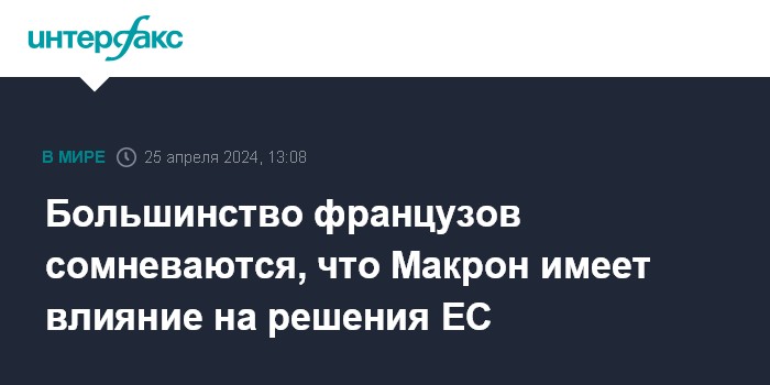 Москва. 25 апреля. INTERFAX.RU - Больше половины французов считают, что президент страны Эммануэль Макрон не имеет реального влияния на функционирование и решения Евросоюза, свидетельствуют результаты опроса для телеканала BFM TV, опубликованные в четверг.