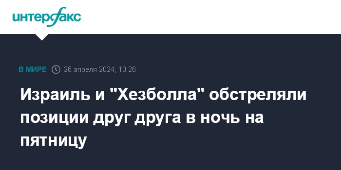 Москва. 26 апреля. INTERFAX.RU - Ливанское шиитское движение "Хезболла" в ночь на пятницу запустило ракеты в сторону Израиля, сообщают израильские СМИ со ссылкой на Армию обороны Израиля (ЦАХАЛ).