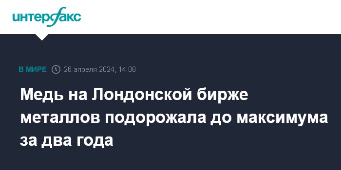 Москва. 26 апреля. INTERFAX.RU - Цены на медь на Лондонской бирже металлов (LME) в пятницу подскочили до двухлетнего максимума, в том числе из-за введенных против российских металлов санкций и повышения спроса, пишет MarketWatch.