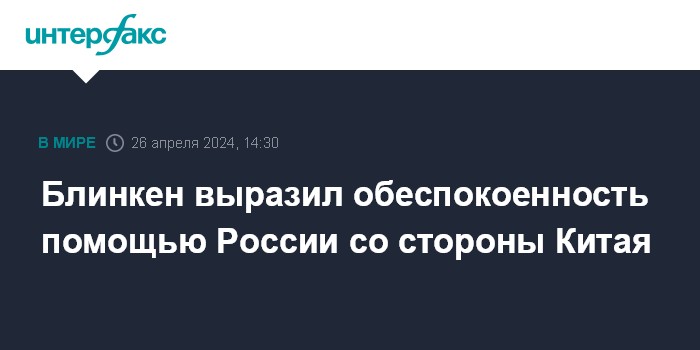 Москва. 26 апреля. INTERFAX.RU - Госсекретарь США Энтони Блинкен после переговоров в Пекине с китайским руководством выразил серьезную обеспокоенность в связи с данными о предполагаемых поставках Китаем оборудования для России, применимого в военной сфере.