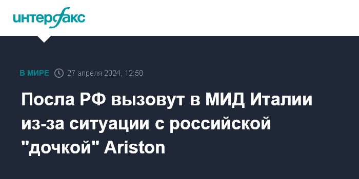 Москва. 27 апреля. INTERFAX.RU - Глава МИД Италии Антонио Таяни заявил, что в его министерство вызовут посла РФ в связи с передачей российской дочерней компании Ariston во временное управление компании группы "Газпром" - АО "Газпром бытовые системы".