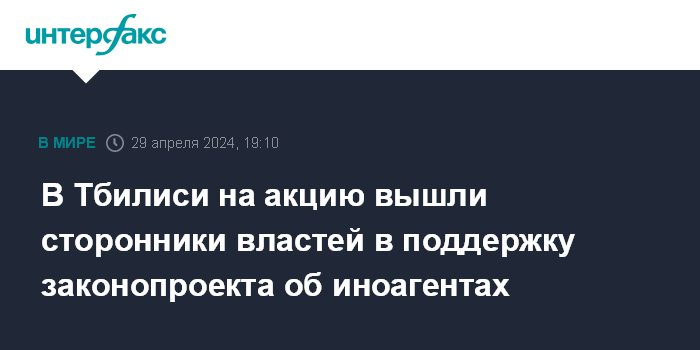 Москва. 29 апреля. INTERFAX.RU - В Тбилиси на проспекте Руставели собрался митинг сторонников властей в поддержку закона об иноагентах.