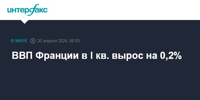 Москва. 30 апреля. INTERFAX.RU - Объем ВВП Франции в первом квартале увеличился на 0,2% по сравнению с предыдущими тремя месяцами, говорится в предварительном отчете национального статистического института Insee.