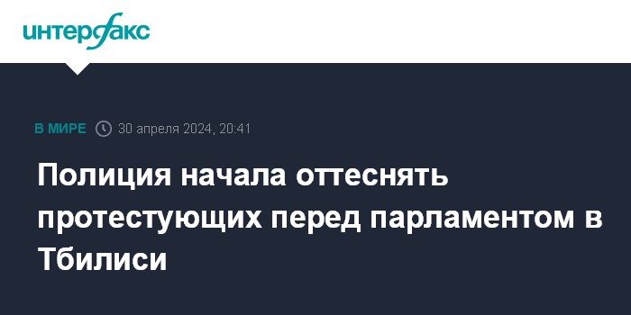 Москва. 30 апреля. INTERFAX.RU - Полиция и спецназ начали оттеснять участников акции протеста, блокирующих выходы из здания парламента Грузии, где завершилось пленарное заседание, на котором рассматривается законопроект об иноагентах.
