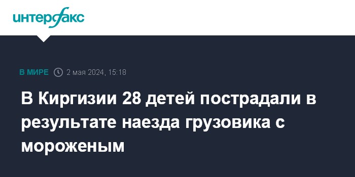 Москва. 2 мая. INTERFAX.RU - В Джалал-Абадской области Киргизии на массовом мероприятии грузовик с мороженым наехал на толпу детей, пострадали 28 детей в возрасте от 9 до 16 лет и один взрослый - учитель, сообщил Миздрав республики.