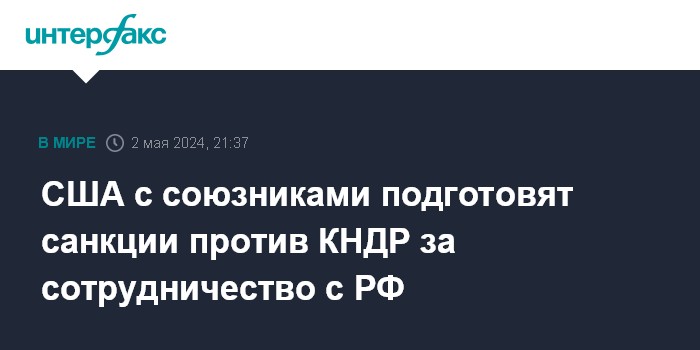 Москва. 2 мая. INTERFAX.RU - Администрация США в сотрудничестве с другими странами готовит новые ограничительные меры против КНДР за сотрудничество с РФ и объявит о них позже в мае, заявил представитель Госдепартамента Мэтью Миллер.