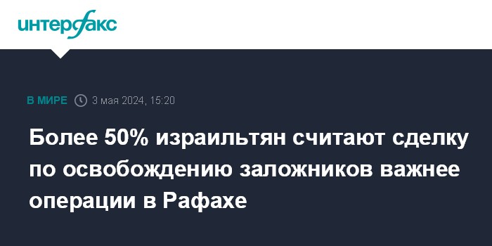 Москва. 3 мая. INTERFAX.RU - Чуть более половины жителей Израиля полагают, что важнее достичь сделки с группировкой ХАМАС по освобождению заложников, нежели проводить наступление на город Рафах в секторе Газа, сообщает The Times of Israel со ссылкой на результаты опроса, проведенного Panel4All.