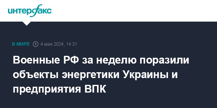 Москва. 4 мая. INTERFAX.RU - Российские военные заявили, что за неделю нанесли 25 групповых ударов высокоточным оружием и беспилотниками по объектам энергетики, транспорта Украины, предприятиям ВПК и арсеналам оружия ВСУ в ответ на атаки по объектам энергетики и промышленности РФ.