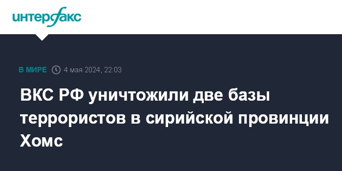 Москва. 4 мая. INTERFAX.RU - ВКС (Воздушно-космические силы) РФ уничтожили в труднодоступных горных районах сирийской провинции Хомс две базы террористов, сообщил на брифинге журналистам заместитель руководителя российского Центра по примирению враждующих сторон в Сирии генерал-майор Юрий Попов.