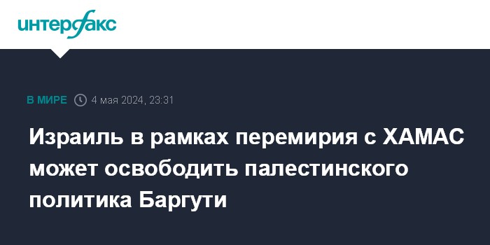 Москва. 4 мая. INTERFAX.RU - Израиль готов освободить отбывающего пожизненный срок популярного палестинского политика Марвана Баргути в рамках возможного соглашения по перемирию с группировкой ХАМАС, сообщают арабские СМИ со ссылкой на источники, знакомые с переговорами.