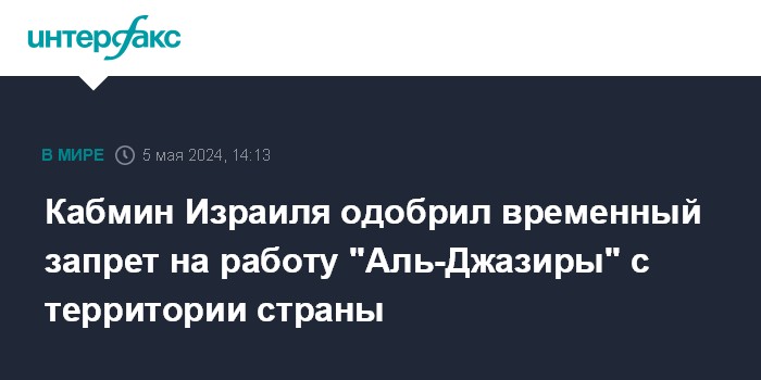 Москва. 5 мая. INTERFAX.RU - Правительство Израиля единогласно приняло решение ввести временный запрет на работу телекомпании "Аль-Джазира" с израильской территории, сообщает издание The Times of Israel.