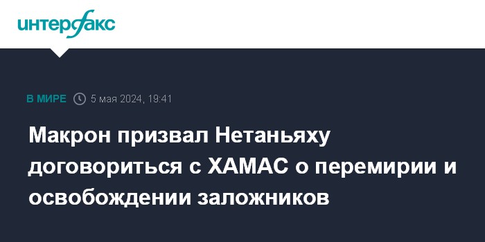 Москва. 5 мая. INTERFAX.RU - Президент Франции Эммануэль Макрон призвал израильского премьер-министра Беньямина Нетаньяху договориться в ходе идущих переговоров с ХАМАС о перемирии в секторе Газа и об освобождении заложников.
