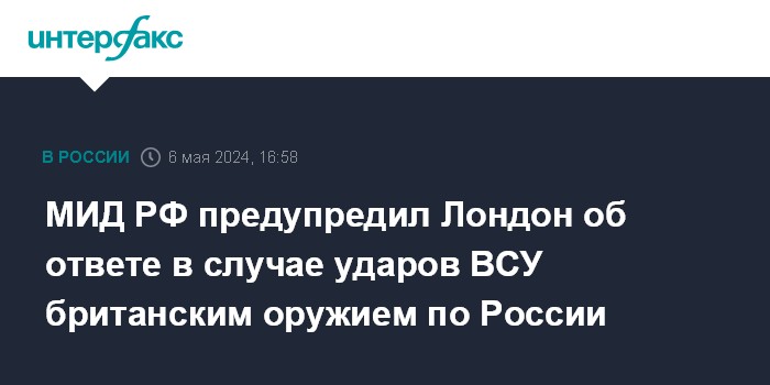Москва. 6 мая. INTERFAX.RU - Посол Великобритании в Москве Найджел Кейси предупрежден, что целью ответа на удары ВСУ британским оружием по территории РФ могут стать любые военные объекты и техника Великобритании как на территории Украины, так и за ее пределами, заявили в понедельник в МИД РФ.