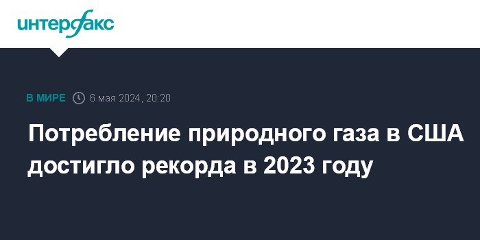 Москва. 6 мая. INTERFAX.RU - Потребление природного газа в США по итогам 2023 года достигло 89,1 млрд кубических футов в сутки, что является самым высоким показателем за время расчетов, говорится в сообщении Управления по информации в области энергетики (EIA) министерства энергетики страны.