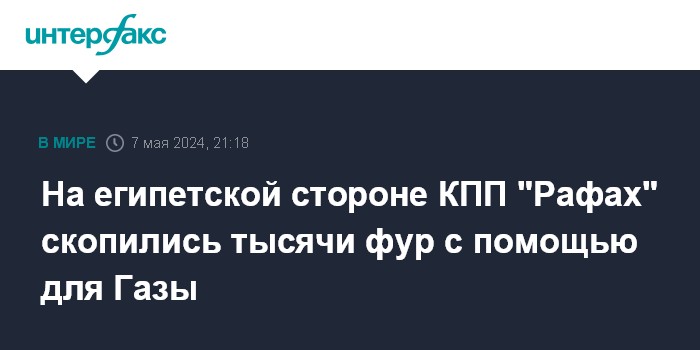 Москва. 7 мая. INTERFAX.RU - Тысячи фур с гуманитарной помощью для сектора Газа скопились во вторник с египетской стороны на КПП "Рафах", сообщает агентство ЭФЭ со ссылкой на представителя египетского Красного Полумесяца.