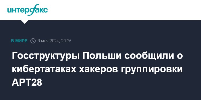 Москва. 8 мая. INTERFAX.RU - Несколько государственных и правительственных учреждений Польши в последние дни подверглись кибератакам хакерской группировки АРТ28, которую польские власти считают связанной с Россией, сообщает в среду Польское телевидение.