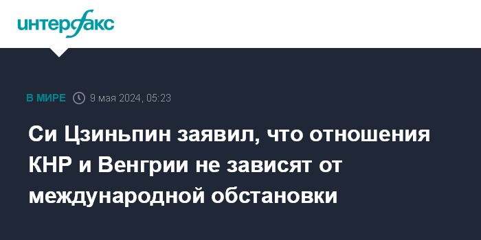 Москва. 9 мая. INTERFAX.RU - Председатель КНР Си Цзиньпин, прибывший в Венгрию с государственным визитом, заявил, что отношения дружбы и сотрудничества между двумя странами не зависят от изменений в обстановке в мире.