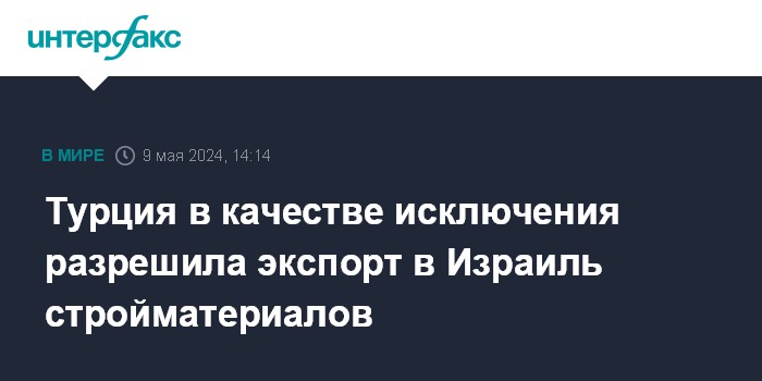 Москва. 9 мая. INTERFAX.RU - Анкара внесла некоторые строительные материалы, в перечень исключений из запрета на импорт и экспорт в Израиль, передает израильский новостной портал Globes со ссылкой на израильские и турецкие официальные лица, говорившие на условиях анонимности.