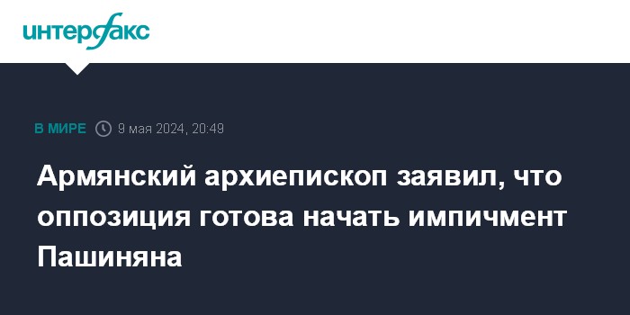 Москва. 9 мая. INTERFAX.RU - Парламентская оппозиция Армении готова запустить процесс импичмента премьер-министра республики Никола Пашиняна, заявил представитель Армянской апостольской церкви, глава Тавушской епархии архиепископ Баграт Галстанян.