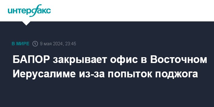 Москва. 9 мая. INTERFAX.RU - Ближневосточное агентство ООН для помощи палестинским беженцам (БАПОР) закрывает свое отделение в восточной, арабской, части Иерусалима из-за попыток поджога, сообщил в четверг глава БАПОР Филипп Лаззарини.