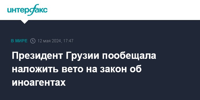 Москва. 12 мая. INTERFAX.RU - Президент Грузии Саломе Зурабишвили заявила, что наложит вето на закон "О прозрачности иностранного влияния", который будет вынесен на голосование в парламенте 14 мая.
