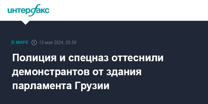 Москва. 13 мая. INTERFAX.RU - Полиция и спецназ вытеснили участников акции протеста с прилегающих к парламенту Грузии улиц, освободив входы в здание, где через несколько часов депутаты обсудят законопроект "О прозрачности иностранного влияния" в последнем чтении.