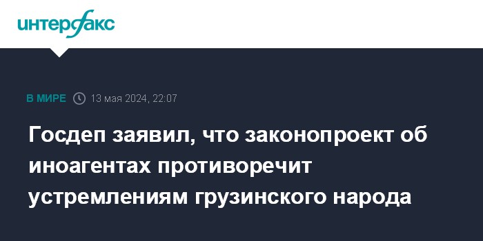 Москва. 13 мая. INTERFAX.RU - Деятельность грузинского руководства по принятию законопроекта "О прозрачности иностранного влияния" противоречит целям народа этой страны, заявил в понедельник представитель Госдепа Ведант Патель.