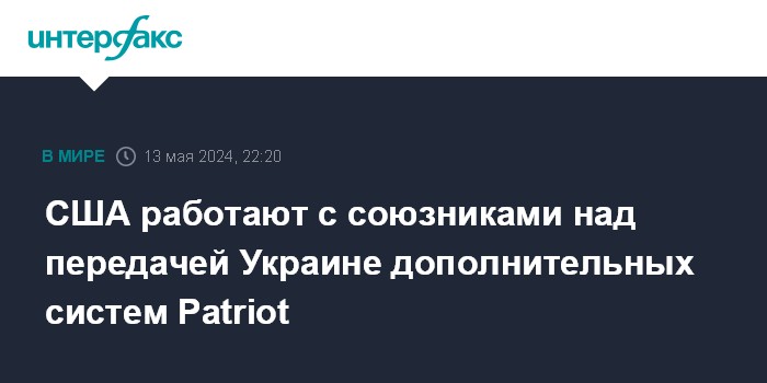 Москва. 13 мая. INTERFAX.RU - Администрация США продолжает контакты с союзниками, нацеленные на то, чтобы найти дополнительные системы ПВО Patriot для Украины, заявил в понедельник советник американского президента по нацбезопасности Джейк Салливан.