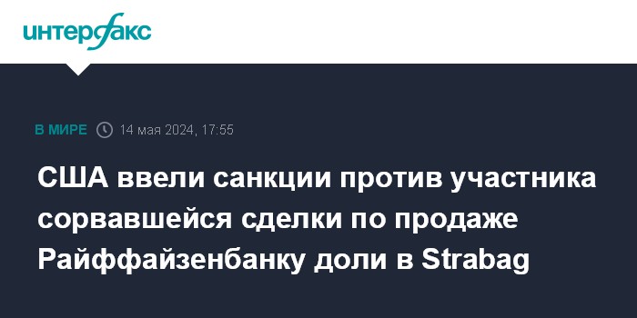 Москва. 14 мая. INTERFAX.RU - США ввели санкции против российской компании, которая должна была выступить стороной сделки по продаже Райффайзенбанку доли в австрийском строительном концерне Strabag SE.