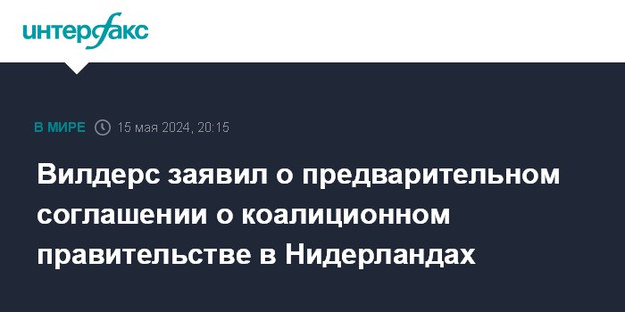 Москва. 15 мая. INTERFAX.RU - Председатель крайне правой нидерландской "Партии за свободу" Герт Вилдерс заявил, что достиг с тремя правоцентристскими партиями предварительного соглашения о формировании коалиционного правительства, сообщает в среду агентство ЭФЭ.