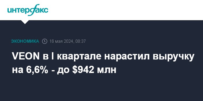 Москва. 16 мая. INTERFAX.RU - В I квартале 2024 года телекоммуникационный холдинг VEON увеличил выручку на 6,6% - до $942 млн, говорится в его отчете.