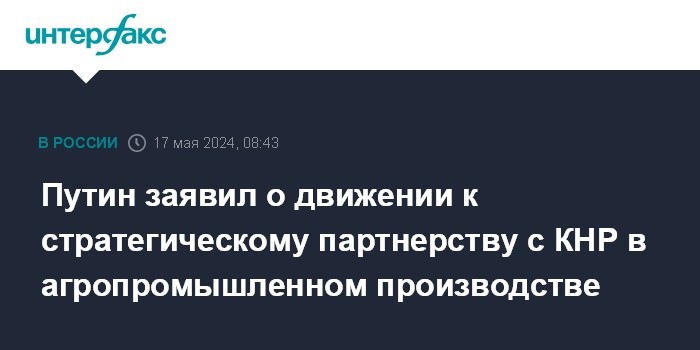 Москва. 17 мая. INTERFAX.RU - Россия и Китай налаживают партнерство в агропромышленном комплексе аналогично партнерству, которое выстроено в энергетической сфере между странами, заявил президент РФ Владимир Путин.