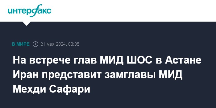 Москва. 21 мая. INTERFAX.RU - На заседании глав МИД стран-участниц Шанхайской организации сотрудничества в Астане 21 мая Иран будет представлять замминистра иностранных дел Мехди Сафари, следует из программы к встрече.